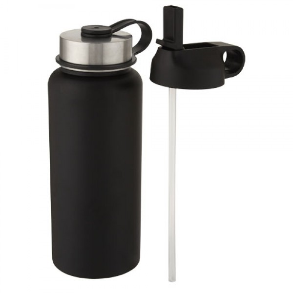 Two-in-one double-walled stainless steel sport bottle with copper vacuum insulation featuring 2 lids: one lid with a straw for easy drinking and one leakproof screw-on lid with handling loop. The insulated 18/8 stainless steel construction prevents condensation on the outside of the bottle, and the on-trend powder coating finish makes it extra durable. Wide opening mouth for easy filling, pouring and cleaning. BPA-free, tested and approved under German Food Safe Legislation (LFGB). Tested and approved for phthalates content according to REACH regulations. Perfect for ice cubes. Volume capacity is 1 litre. Hand wash recommended. Presented in a recycled cardboard gift box.
