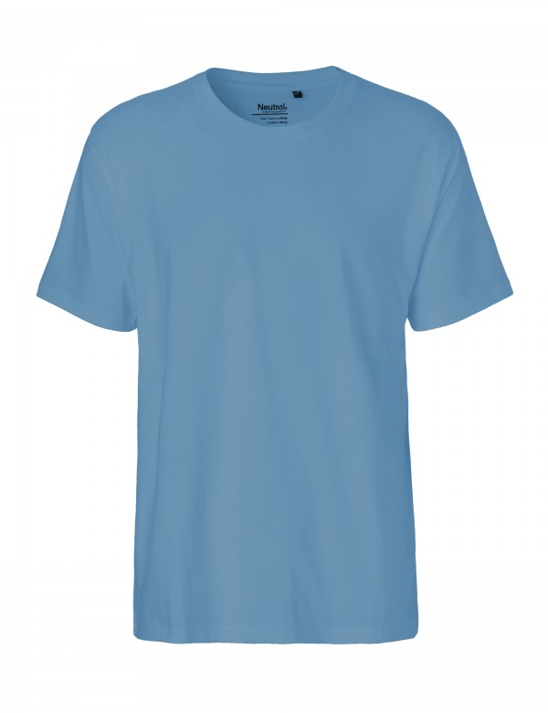 100% Organic Fairtrade Cotton. Single jersey knit. 185 g/m2. Classic fitted. Regular short sleeves. Crew neck. Elastane rib knitted neckband. Neck tape. Ring spun combed cotton. No GMO Seeds, no pesticides, no toxic dyes, GOTS Certified. EU Ecolabel for eco production. SA8000 for factory conditions. OEKO-TEX for harmful substances. Manufactured using 100% self-generated green energy.