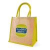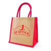 Medium sized, natural, eco-friendly jute bag with gusset, padded cotton webbed handles, coloured jute trim and laminated backing.