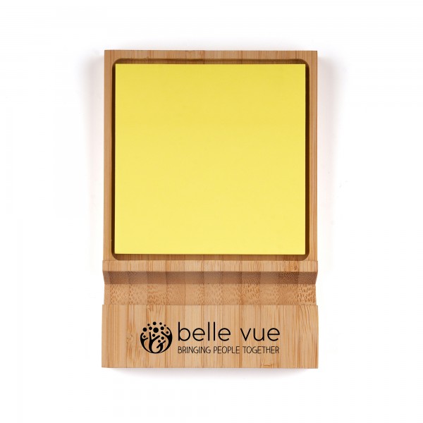 Promote your business in style with this 2-in-1 natural bamboo phone stand and sticky note holder. Featuring 50 square, yellow sticky notes that can be refilled over and over again making this a long lasting promotional desk item.